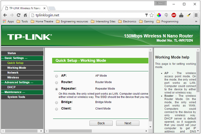 Click quick setup and then next, choose Repeater and then click next again